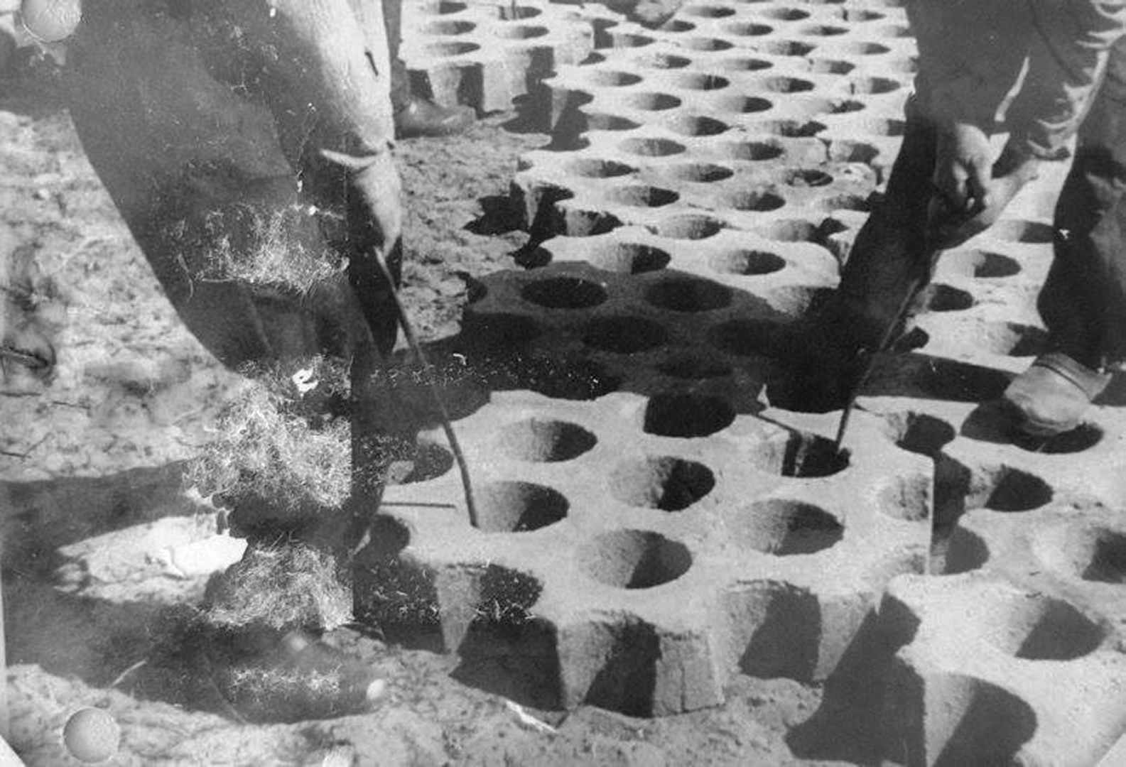 En del flyverskjulsten blev genanvendt som veje og fundamenter i de seks tyske flygtningelejre, som var etableret på Sydamager 1945-1948. Foto fra 1946 af Dragørlejren ved Kirkevej.